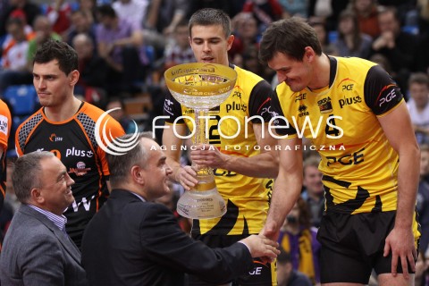 22.01.2012 RZESZOW SIATKOWKA PUCHAR POLSKI 2012 MEN VOLLEYBALL ENEA CUP MEN MECZ FINAL JASTRZEBSKI WEGIEL - PGE SKRA BELCHATOW N/Z MINISTER WALDEMAR PAWLAK WRECZA PUCHAR MARIUSZ WLAZLY I DANIEL PLINSKI FOT MACIEJ GOCLON / FOTONEWS