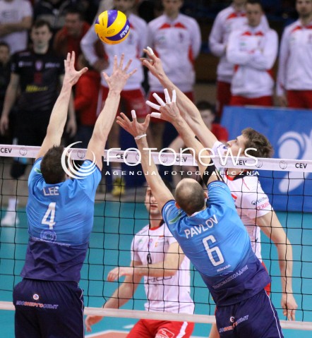 28.03.2012 RZESZOW SIATKOWKA PUCHAR CEV FINAL 2012 MEN 2011/2012 CEV VOLLEYBALL CUP MEN MECZ ASSECO RESOVIA RZESZOW - DYNAMO MOSKWA N/Z PIOTR NOWAKOWSKI DAVID LEE NIKOLAY PAVLOV FOT MACIEJ GOCLON / FOTONEWS