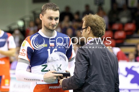15.09.2012 KROSNO SIATKOWKA V TURNIEJ O PUCHAR PREZYDENTA MIASTA KROSNA MECZ ASSECO RESOVIA RZESZOW - ZAKSA KEDZIERZYN KOZLE N/Z MICHAL RUCIAK ODBIERA PUCHAR FOT MACIEJ GOCLON / FOTONEWS
