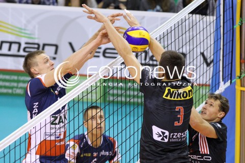 15.09.2012 KROSNO SIATKOWKA V TURNIEJ O PUCHAR PREZYDENTA MIASTA KROSNA MECZ ASSECO RESOVIA RZESZOW - ZAKSA KEDZIERZYN KOZLE N/Z JURIJ GLADYR WOJCIECH GRZYB LUKAS TICHACEK FOT MACIEJ GOCLON / FOTONEWS