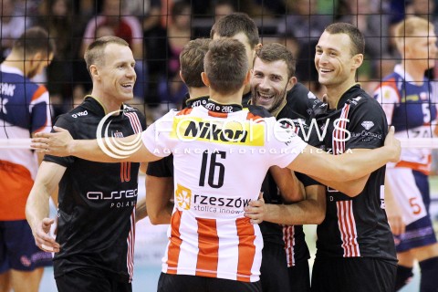 15.09.2012 KROSNO SIATKOWKA V TURNIEJ O PUCHAR PREZYDENTA MIASTA KROSNA MECZ ASSECO RESOVIA RZESZOW - ZAKSA KEDZIERZYN KOZLE N/Z TOMASZ JOZEFACKI NIKOLA KOVACEVIC PAUL LOTMAN RADOSC SIATKARZY ASSECO RESOVIA FOT MACIEJ GOCLON / FOTONEWS