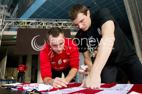 12.04.2013 RZESZOW SIATKOWKA PLUSLIGA TRENING SIATKARZY ASSECO RESOVIA PRZED FINALEM PLUSLIGI N/Z MACIEJ DOBROWOLSKI I WOJCIECH GRZYB PODPISUJE KOSZULKI KTORE BEDA DO WYGRANIA FOT MACIEJ GOCLON / FOTONEWS