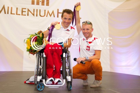 17.09.2012 RZESZOW RAFAL WILK - DWUKROTNY ZLOTY MEDALISTA IGRZYSK PARAOLIMPIJSKICH W LONDYNIE PODCZAS SPOTKANIA Z KBIICAMI N/Z RAFAL WILK I TRENER JAKUB PIENIAZEK FOT MACIEJ GOCLON / FOTONEWS
