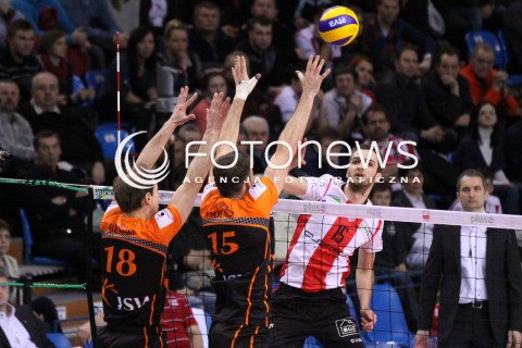 02.03.2012 RZESZOW SIATKOWKA PLUS LIGA 2011/2012 MEN VOLLEYBALL POLAND POLISH PLUSLIGA LEAGUE SEASON 2011/2012 MECZ ASSECO RESOVIA RZESZOW - JSW JASTRZEBSKI WEGIEL N/Z ATAK MATEUSZ MIKA BLOK RUSSELL HOLMES LUCIANO BOZKO FOT MACIEJ GOCLON / FOTONEWS