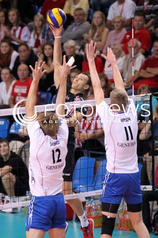 23.09.2012 RZESZOW SIATKOWKA MIEDZYNARODOWY TURNIEJ IM JANA STRZELCZYKA MEN VOLLEYBALL INTERNATIONAL STRZELCZYK MEMORIAL MECZ ASSECO RESOVIA - GENERALI UNTERHACHING N/Z PAUL LOTMAN SIMON HIRSCH KONSTANTIN SHUMOV FOT MACIEJ GOCLON / FOTONEWS