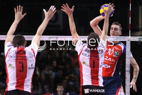 04.02.2012 RZESZOW SIATKOWKA PLUS LIGA 2011/2012 MEN VOLLEYBALL POLAND POLISH PLUSLIGA LEAGUE SEASON 2011/2012 MECZ ASSECO RESOVIA RZESZOW - ZAKSA KEDZIERZYN KOZLE N/Z ATAK GUILLAUME SAMICA BLOK MACIEJ DOBROWOLSKI WOJCIECH GRZYB FOT MACIEJ GOCLON / FOTONEWS