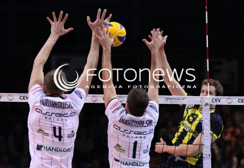 08.02.2012 RZESZOW SIATKOWKA PUCHAR CEV CHALLENGE ROUND 2012 MEN 2011/2012 CEV VOLLEYBALL CUP MEN MECZ ASSECO RESOVIA RZESZOW - FENERBAHCE GRUNDIG STAMBUL N/Z ATAK RODRIGO QUIROGA BLOK MACIEJ DOBROWOLSKI PIOTR NOWAKOWSKI FOT MACIEJ GOCLON / FOTONEWS