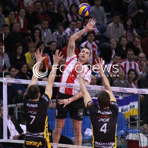 21.01.2012 RZESZOW SIATKOWKA PUCHAR POLSKI 2012 MEN VOLLEYBALL ENEA CUP MEN MECZ POLFINAL SEMIFINAL ASSECO RESOVIA - PGE SKRA BELCHATOW N/Z ATAK GYORGY GROZER BLOK BARTOSZ KUREK DANIEL PLINSKI FOT MACIEJ GOCLON / FOTONEWS