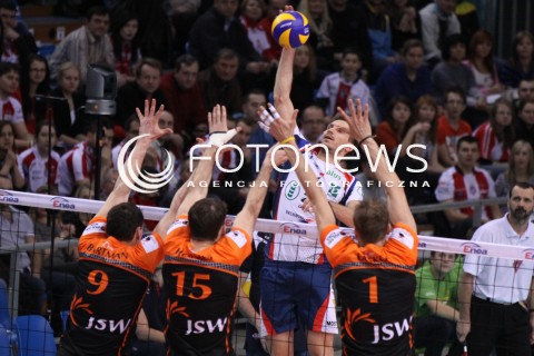 21.01.2012 RZESZOW SIATKOWKA PUCHAR POLSKI 2012 MEN VOLLEYBALL ENEA CUP MEN MECZ POLFINAL SEMIFINAL ZAKSA KEDZIERZYN KOZLE - JASTRZEBSKI WEGIEL N/Z ATAK ANTONIN ROUZIER BLOK MICHAL LASKO ZBIGNIEW BARTMAN RUSSELL HOLMES FOT MACIEJ GOCLON / FOTONEWS