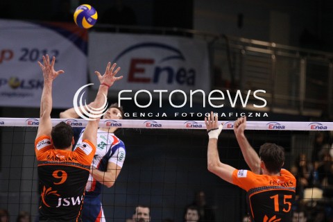 21.01.2012 RZESZOW SIATKOWKA PUCHAR POLSKI 2012 MEN VOLLEYBALL ENEA CUP MEN MECZ POLFINAL SEMIFINAL ZAKSA KEDZIERZYN KOZLE - JASTRZEBSKI WEGIEL N/Z ATAK ANTONIN ROUZIER BLOK ZBIGNIEW BARTMAN RUSSELL HOLMES FOT MACIEJ GOCLON / FOTONEWS