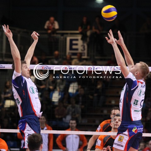 21.01.2012 RZESZOW SIATKOWKA PUCHAR POLSKI 2012 MEN VOLLEYBALL ENEA CUP MEN MECZ POLFINAL SEMIFINAL ZAKSA KEDZIERZYN KOZLE - JASTRZEBSKI WEGIEL N/Z ATAK ZBIGNIEW BARTMAN BLOK WOJCIECH KAZMIERCZAK PAWEL ZAGUMNY FOT MACIEJ GOCLON / FOTONEWS