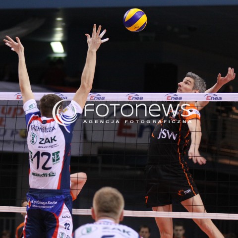 21.01.2012 RZESZOW SIATKOWKA PUCHAR POLSKI 2012 MEN VOLLEYBALL ENEA CUP MEN MECZ POLFINAL SEMIFINAL ZAKSA KEDZIERZYN KOZLE - JASTRZEBSKI WEGIEL N/Z ATAK JOHANNES BONTJE BLOK WOJCIECH KAZMIERCZAK FOT MACIEJ GOCLON / FOTONEWS