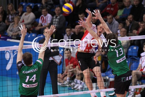 14.01.2012 RZESZOW SIATKOWKA PLUS LIGA 2011/2012 MEN VOLLEYBALL POLAND POLISH PLUSLIGA LEAGUE SEASON 2011/2012 MECZ ASSECO RESOVIA RZESZOW - FART KIELCE N/Z ATAK OLIEG ACHREM BLOK ADAM KAMINSKI PIERRE PUJOL FOT MACIEJ GOCLON / FOTONEWS