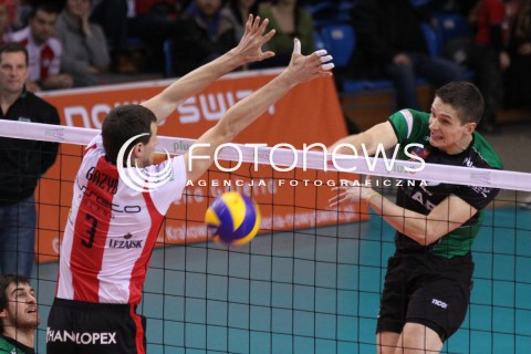 14.01.2012 RZESZOW SIATKOWKA PLUS LIGA 2011/2012 MEN VOLLEYBALL POLAND POLISH PLUSLIGA LEAGUE SEASON 2011/2012 MECZ ASSECO RESOVIA RZESZOW - FART KIELCE N/Z ATAK MILOSZ ZNISZCZOL BLOK WOJCIECH GRZYB FOT MACIEJ GOCLON / FOTONEWS