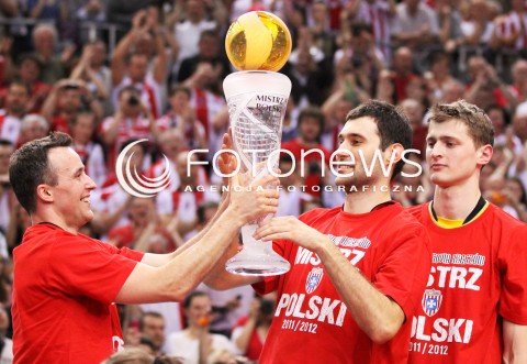 22.04.2012 RZESZOW SIATKOWKA PLUSLIGA 4. MECZ FINALOWY SEZONU 2011/2012 MEN VOLLEYBALL PLUSLIGA SEASON 2011/2012 FINAL GAME NUMBER 4 ASSECO RESOVIA - PGE SKRA BELCHATOW N/Z MACIEJ DOBROWOLSKI GRZEGORZ KOSOK PIOTR NOWAKOWSKI RADOSC WYGRANA DEKORACJA KORONACJA SIATKARZY ASSECO RESOVIA FOT MACIEJ GOCLON / FOTONEWS